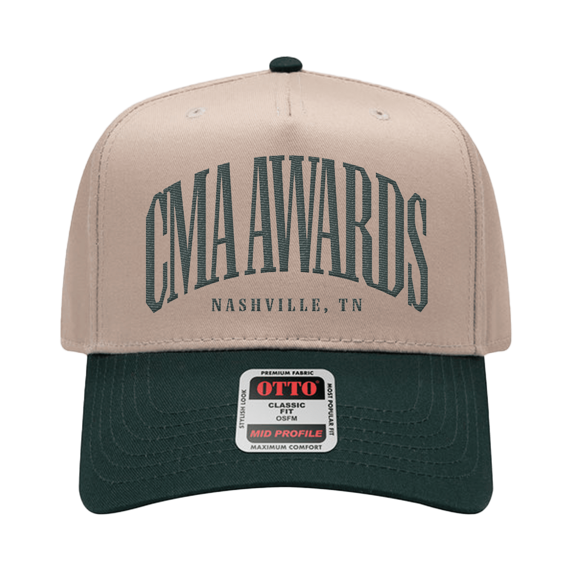 Classic mid-profile hat featuring CMA Awards arched embroidery and Nashville, TN detail. Beige crown with deep green bill.