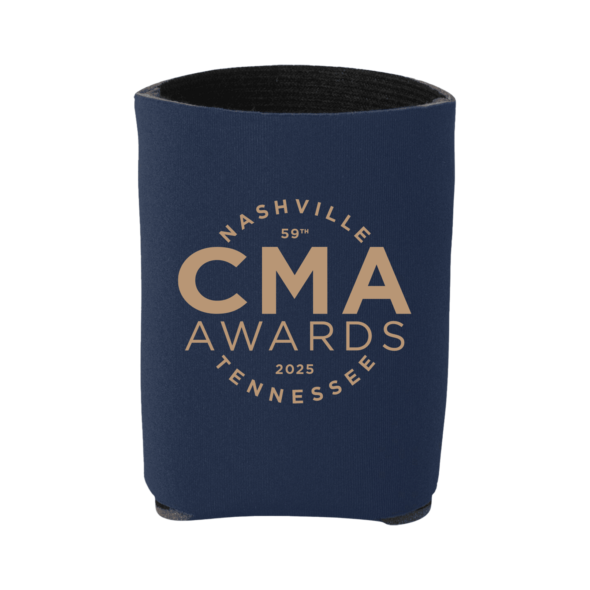 Navy can koozie cooler featuring the 59th Annual CMA Awards logo.